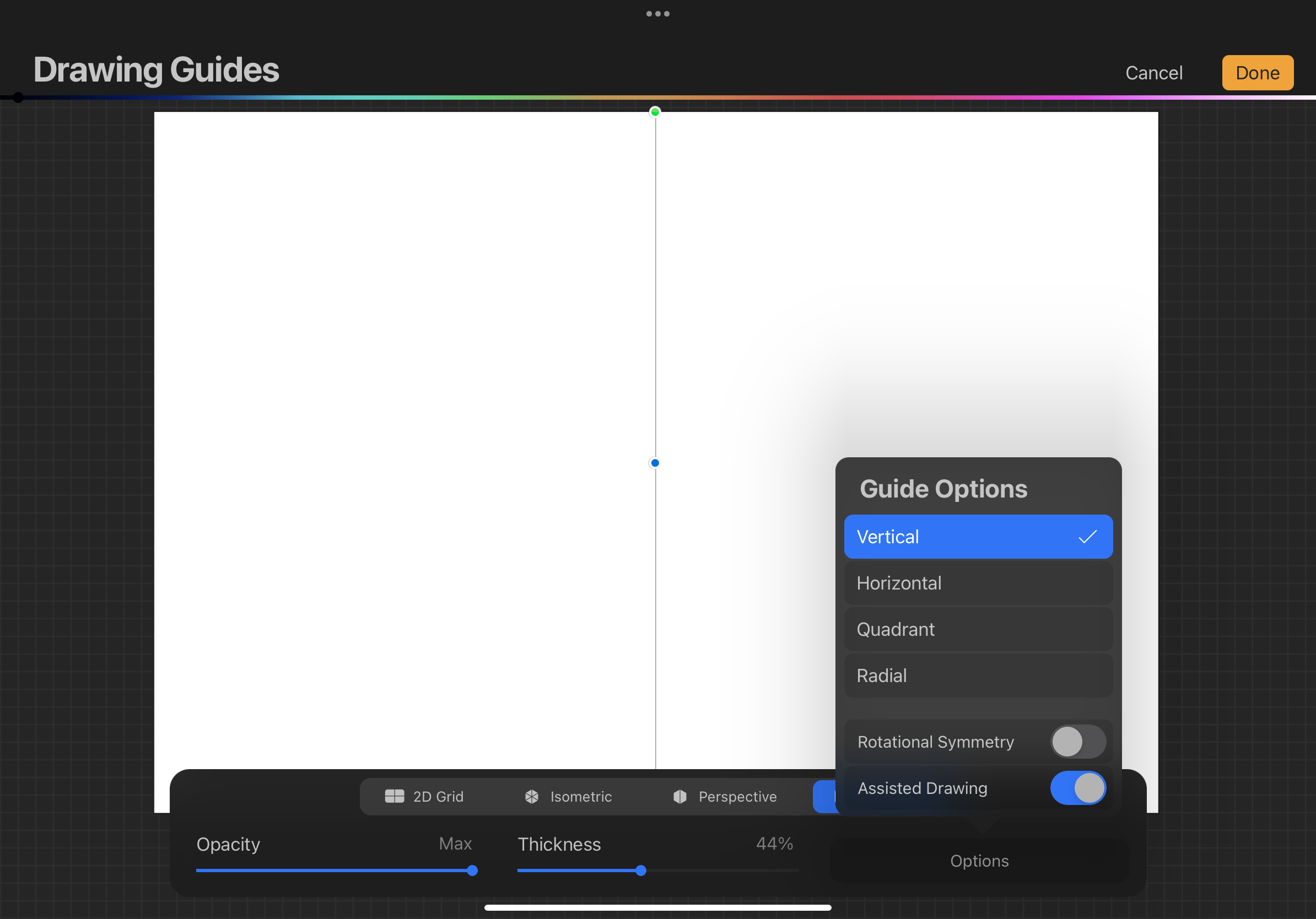 In this panel, you can choose which guide youâd like to use, adjust the opacity and thickness of your symmetry line, and even change the color to your liking!