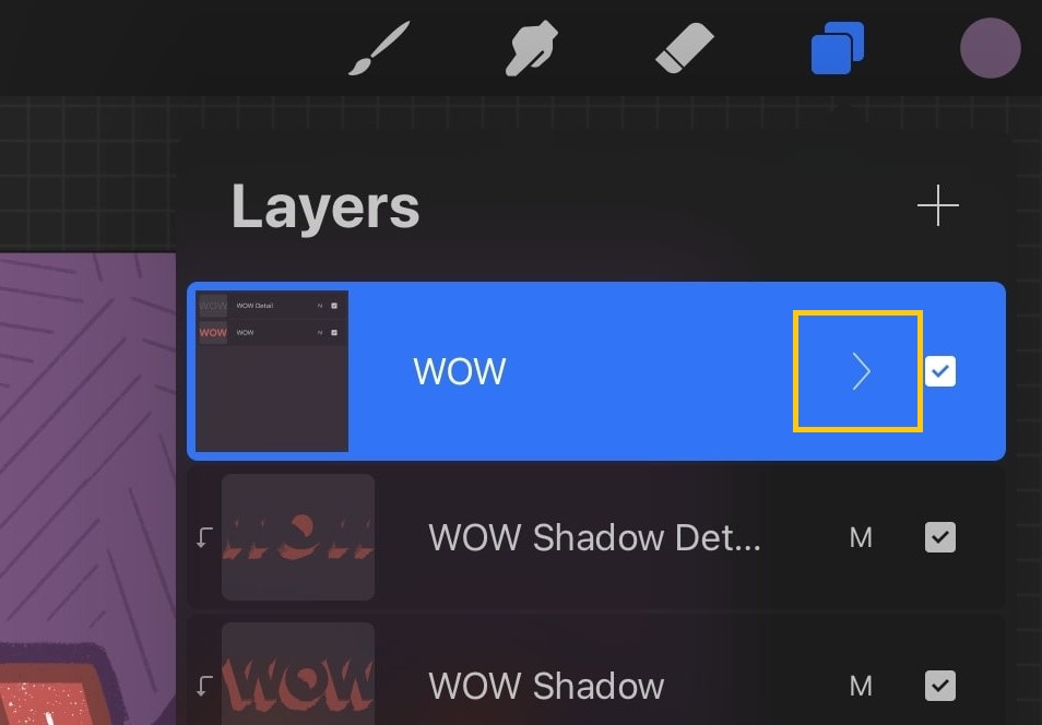 I want to group together the layers named âWOWâ and âWOW Detailâ so it would be easier for me to move them. To do this, Iâll tap on the upper layer to open the layer options. In this case, itâs the âWOW Detailâ layer.
