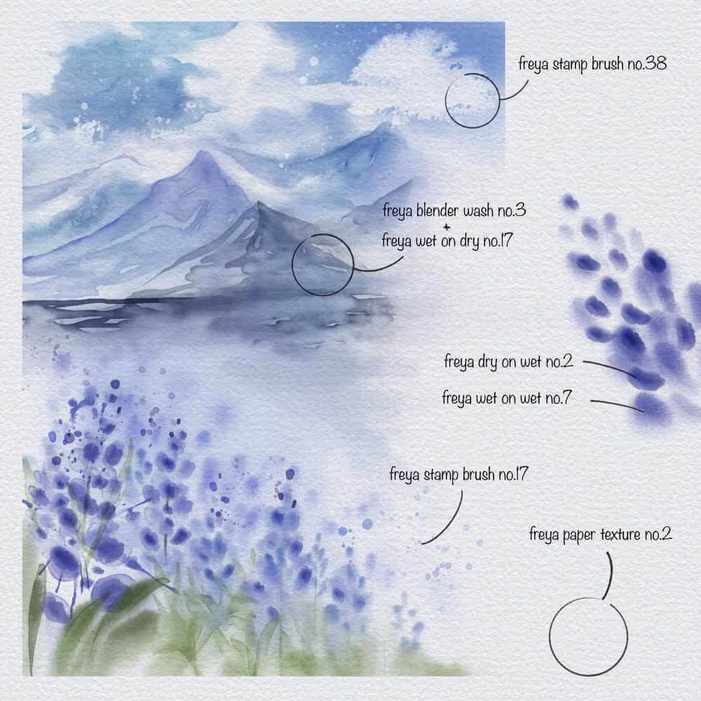 I first thought this set is going to include about 20 brushes, but when digging into it, I decided to cover ALL the watercolor scenarios out there. For the icing on the cake, I also threw in some nice custom paper textures that really make the paintings look even more realistic and even a mini-course that teaches you how to use the brushes!