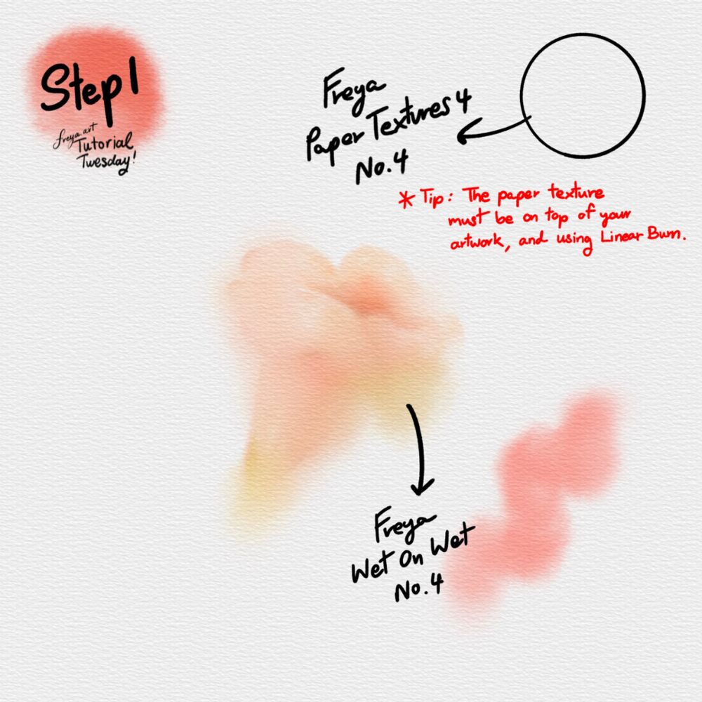 Step 1: Now add a paper background using Freya Paper Texture No. 4 in a light grey color. Set the layer to Linear Burn and lock this layer. This layer should be on top of all the succeeding layers so that its texture will apply to the entire artwork. In another layer, start coloring the base using Freya Wet on Wet No. 4. Lighter shades to the outer areas, darker shades in between petals and under folds.