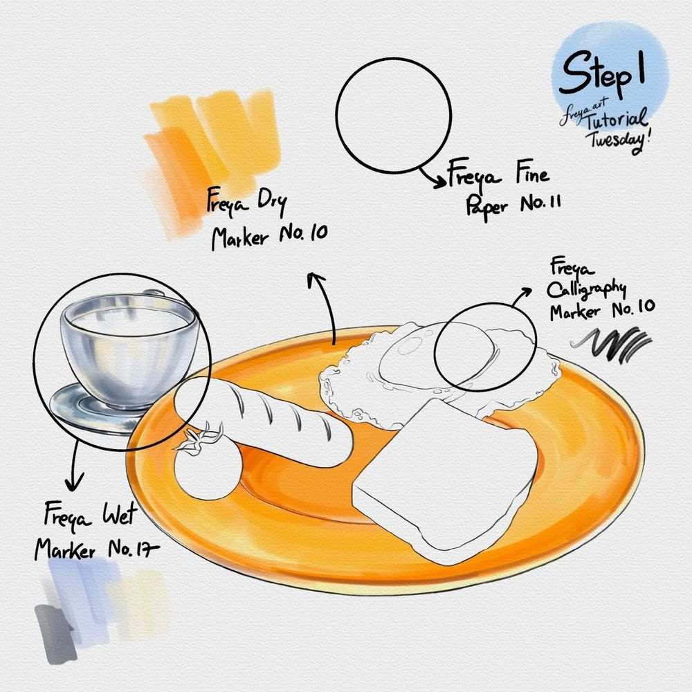 On a new layer, add the paper texture using Freya Fine Paper No.11. Then on another layer, draw the outline using Freya Calligraphy Marker No. 10. On another layer, color in the plate using Freya Dry Marker No. 10. Make the edges darker to create depth. Add another layer, use Freya Wet Marker No. 17 to color the coffee mug. Use shades of grey and light blue to create a reflective surface, while using a very light yellow to mimic the reflected color from the plate. Leave some parts white to act as highlight.