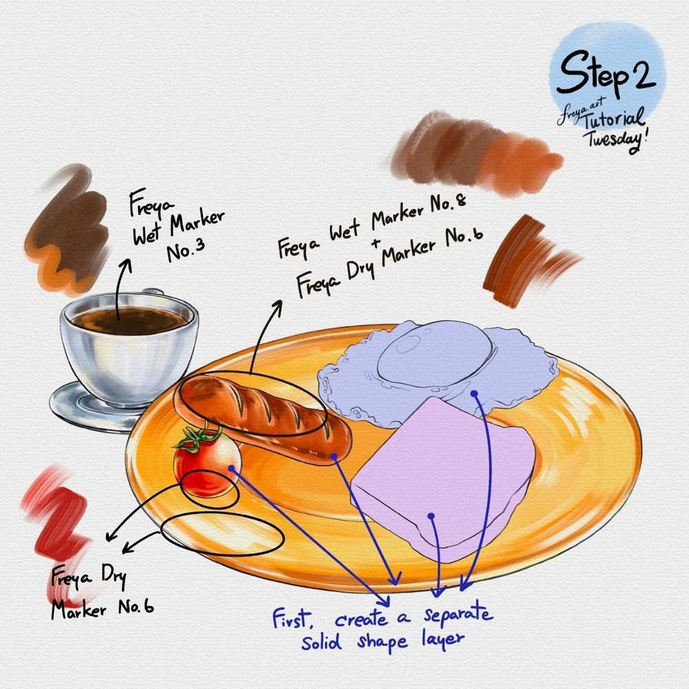 Step 3: Now let's move on to the toast. We'll start coloring the base using a beige color, then slowly build up the darker brown color using Freya Dry Marker No. 10 and No 6. Create those strokes so it looks more natural. Don't forget to lighten the edges a bit just to highlight the shape edge.