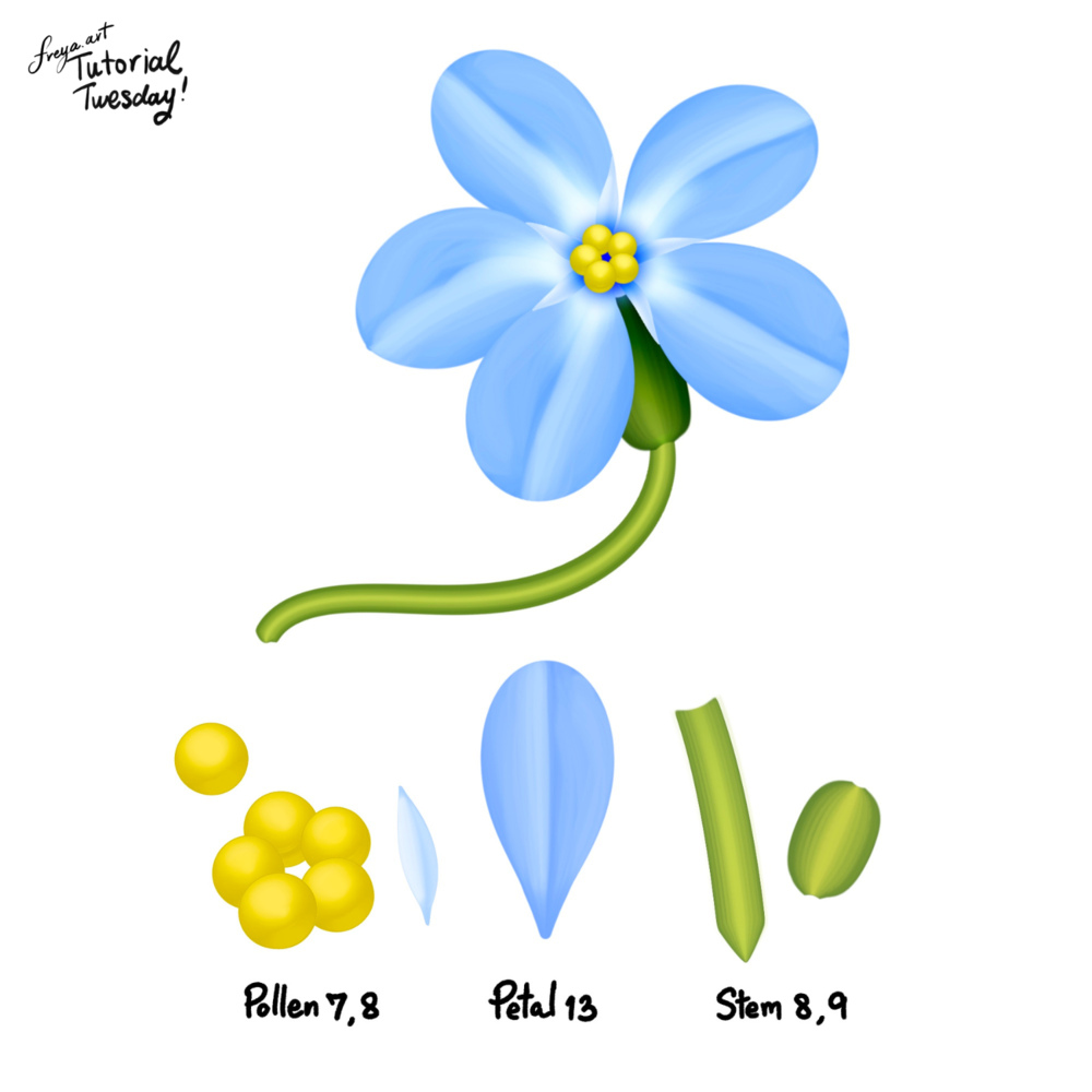 Hello, in today's tutorial we are going to draw Scorpion Grass or Forget-Me-Not flowers using premium brushes from the Effortless Flower Brush Set. Please download the materials before we begin. You'll find the tutorial PDF and swatch palette in the download folder.