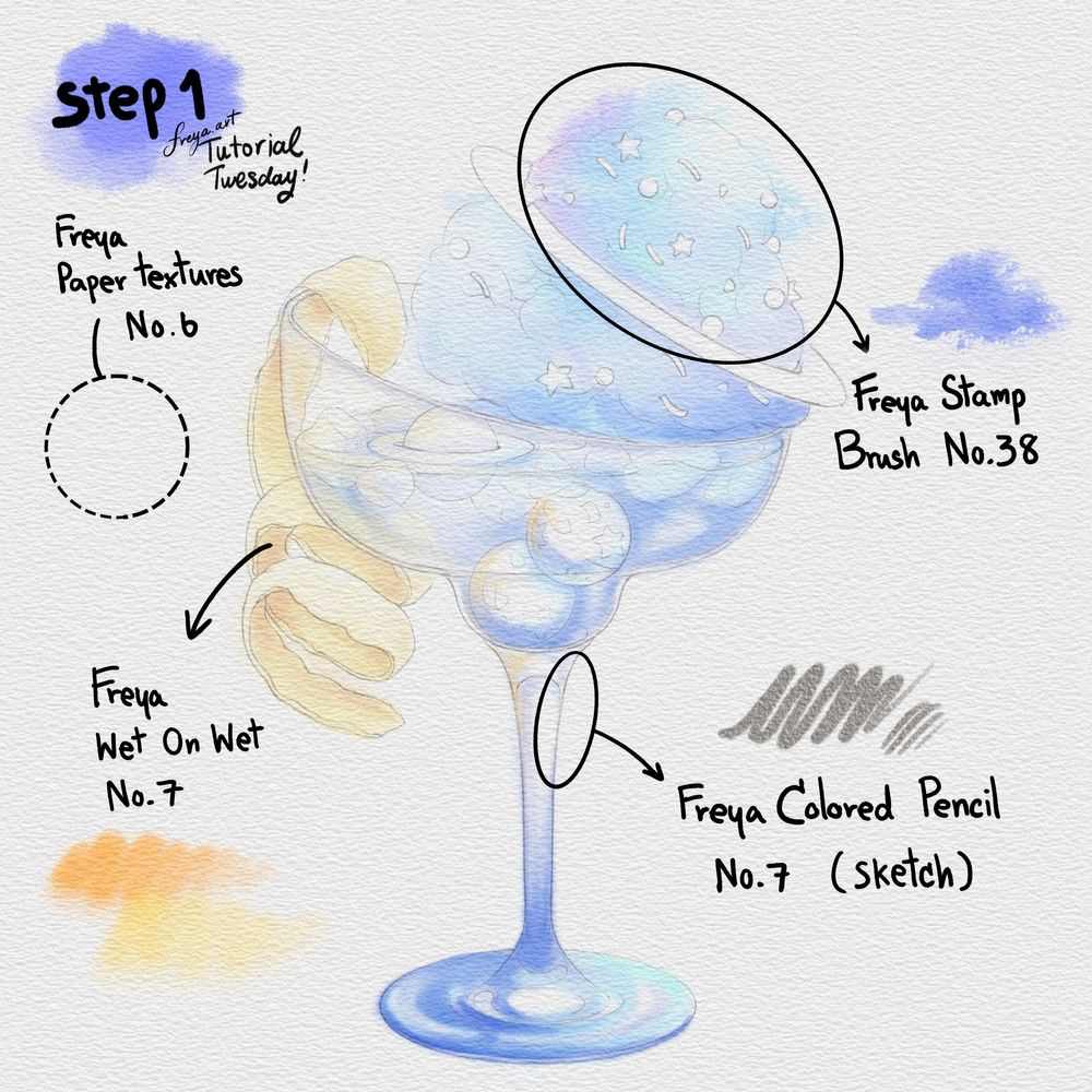 Hello! Today we're going to draw this fun Galaxy Margarita using the premium brushes from my Ultimate Watercolor Brush set. Please download the tutorial files first. You'll get the Tutorial PDF, sketch, and swatch file for this project.