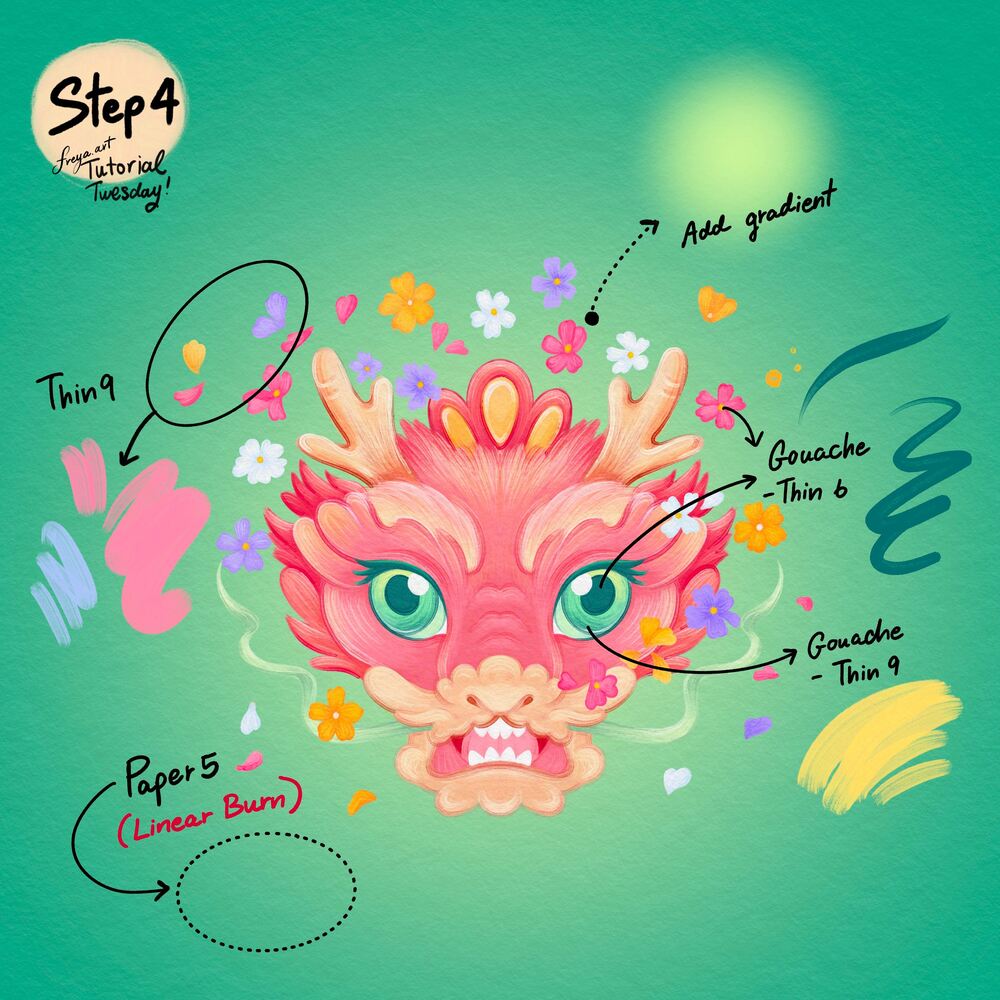 Step 3: Continue adding details with the Freya Gouache Thin No. 6 brush. Adding strokes of lighter colors give it a brushed look. Add a new layer for the flowers. Use the same Freya Gouache Thin No. 6 brush to draw the flowers. Add variation, draw some of the flowers facing sideways and others front facing.
