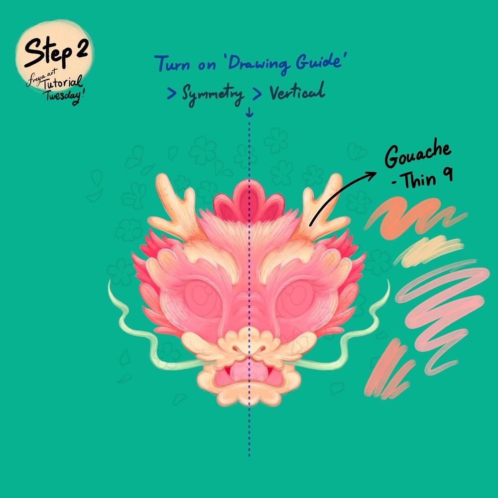 Hello and welcome to the first tutorial for 2024. In today's tutorial we are going to use premium brushes from the Freya Realistic Gouache Brush Set to color this Dragon Head illustration. We'll also be using Procreate's symmetry function as we color.