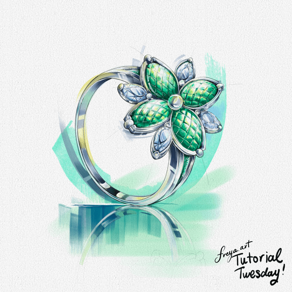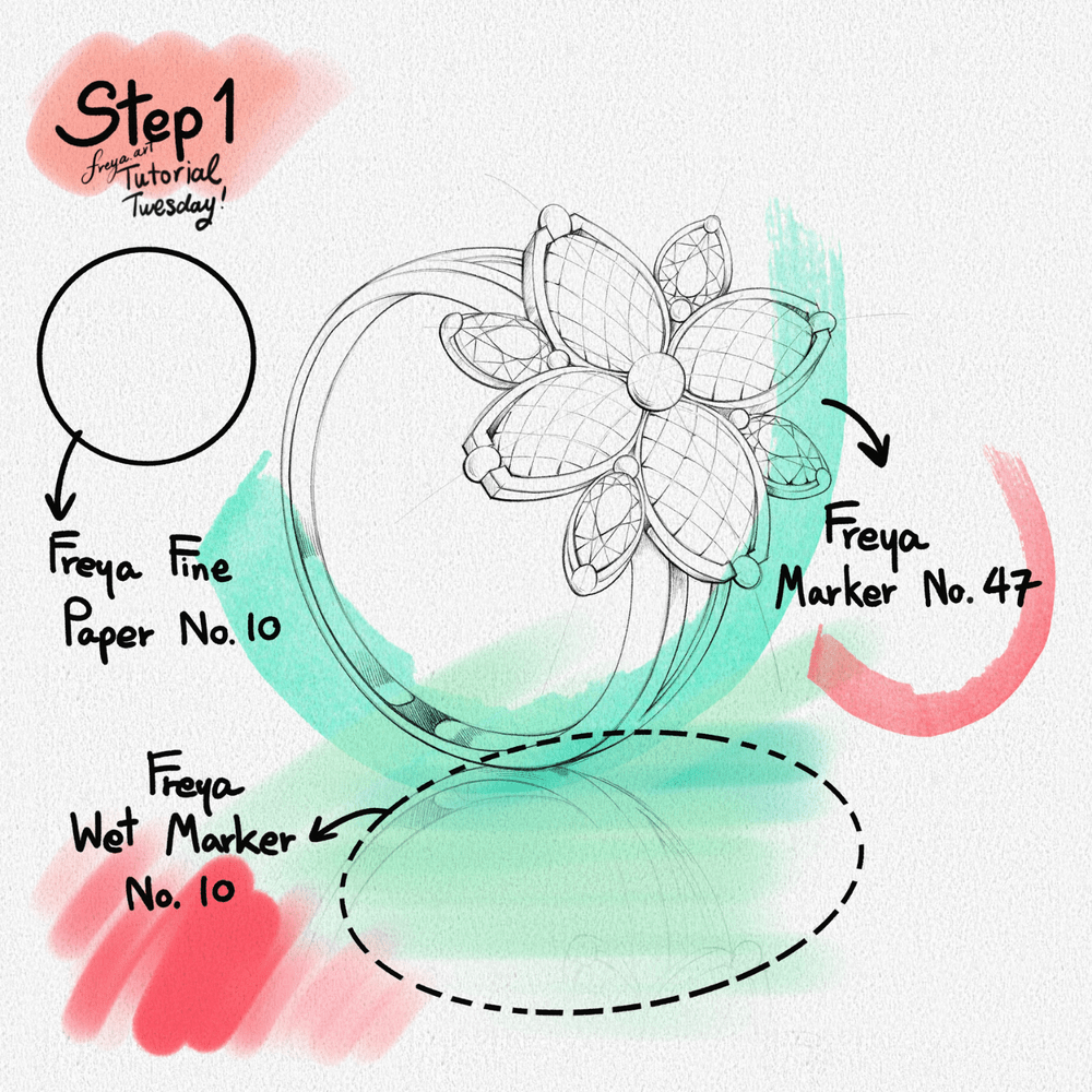 Step 2: Add another layer and start to color the ring with grey, blue, light yellow and light green using Freya Wet Marker No. 10. The yellow and green will act as highlight and reflection.