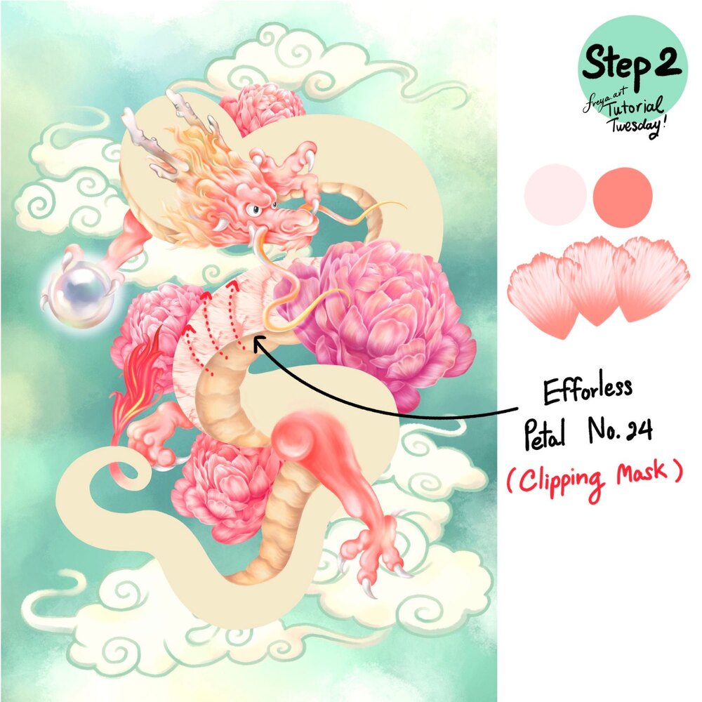 Hello! In this tutorial, I will show you how to use a brush from my Effortless Flower Brush Set to make dragon scales. Please download the tutorial files before we begin. You will get the tutorial PDF, sketch, swatch palette, and sample brush for this project!
