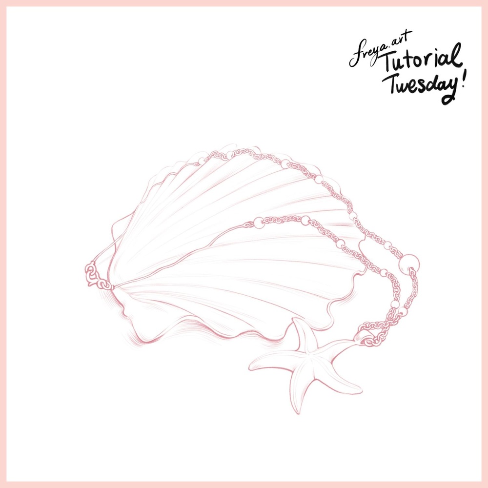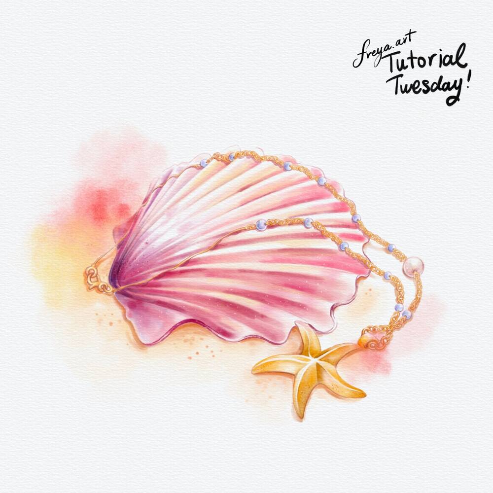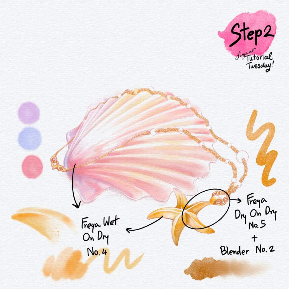 Step 2: Continue adding layers under the sketch layer, for each element of the composition. Using Freya Dry on Dry No. 5 and Blender No.2 Brush, create a gold tone for the necklace string and pendant. Add some hints of golden brown color to the shell with the Freya Wet on Dry No. 4 brush.