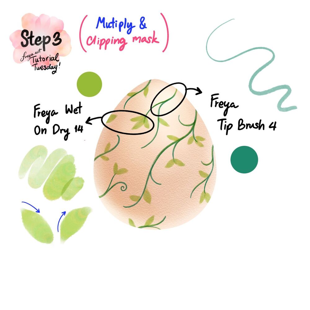 Step 4: Add another clipping mask layer and set it to Multiply. This time we’re going to use the Freya Wet on Dry No. 18 brush to draw over the stems. Don't forget to set the primary and secondary colors for the Freya Tip Brush No. 4 when you draw the flower petals. Add another layer underneath the egg base layer, and using the Freya Wet on Wet No. 4 brush draw the shade underneath the egg.