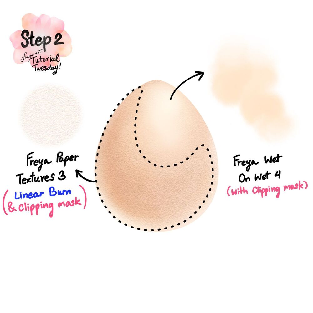 Step 2: Add another clipping mask layer and continue adding highlights on top using as lighter beige color and the Freya Wet on Wet No. 4 brush. Add another clipping mask layer and set it to Linear Burn mode. Then using the Freya Paper Texture No. 3 brush, paint along the side as indicated.